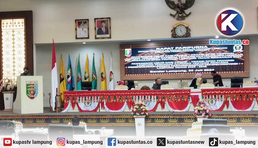 Kupastuntas.co, Bandar Lampung - DPRD Provinsi Lampung menggelar rapat paripurna dalam rangka lanjutan pembicaraan tingkat I pemandangan umum dan fraksi-fraksi terhadap raperda pertanggung jawaban pelaksanaan APBD Provinsi Lampung tahun anggaran 2023, Selasa (23/7/2024).
