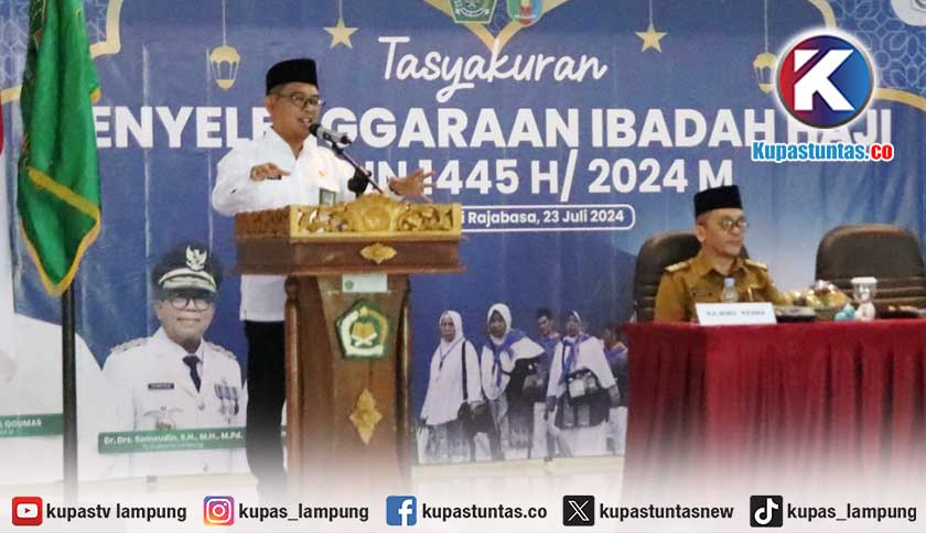 Kupastuntas.co, Bandar Lampung - Kantor Wilayah Kementerian Agama Provinsi Lampung menggelar Tasyakuran Penyelenggaraan Ibadah Haji Tahun 1445 H/2024 M, di Aula Arafah Asrama Haji Lampung, Selasa (23/7/2024).