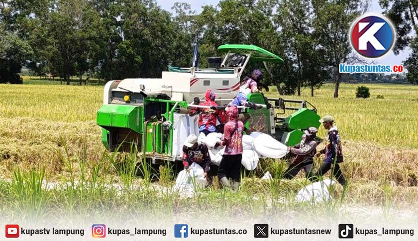 Aktivitas petani saat memanen padi di areal persawahan di Kecamatan Sidomulyo, Kabupaten Lampung Selatan, Jumat (11/4/2025). Foto: Handika/kupastuntas.co