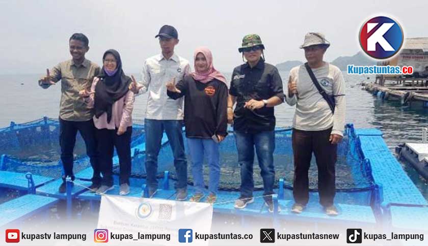 Kadis Perikanan Pesawaran Zainal Arifin (kedua dari kanan) berfoto bersama kelompok pembudidaya ikan di keramba jaring apung dari Kementerian Kelautan dan Perikanan. Foto: Ist