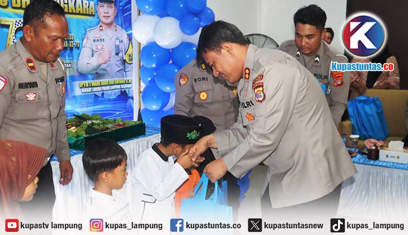 Kupastuntas.co, Lampung Selatan - Tidak hanya berjibaku menertibkan pengendara, jajaran Satlantas Polres Lampung Selatan juga menunjukkan sisi humanisnya dalam momen Hari Ulang Tahun (HUT) Lalu Lintas Bhayangkara ke-70.