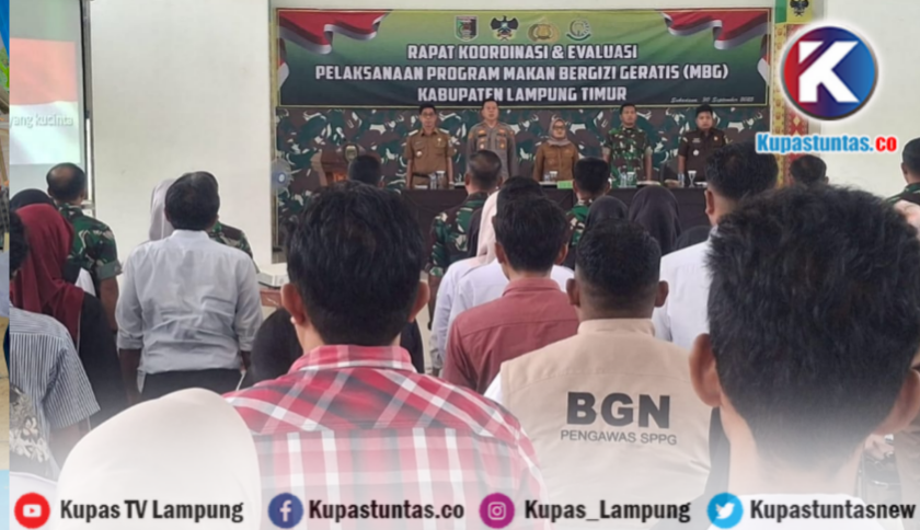 Kupastuntas.co, Lampung Timur - Rapat koordinasi dan evaluasi pelaksanaan program Makan Bergizi Gratis (MBG) digelar di Aula Makodim 0429/Lamtim, Selasa (30/9/2025). Rapat ini diikuti jajaran pemerintah daerah, Forkopimda, hingga perwakilan pengelola dapur MBG.