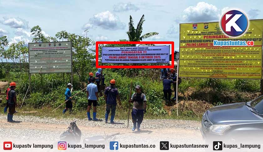 Kupastuntas.co, Mesuji - Untuk ketiga kalinya PT Sumber Indah Perkasa (SIP) memasang banner imbauan akan dilakukan penertiban terkait lahan HGU miliknya yang diduduki masyarakat dengan mengatasnamakan Masyarakat Adat Buay Mencurung.