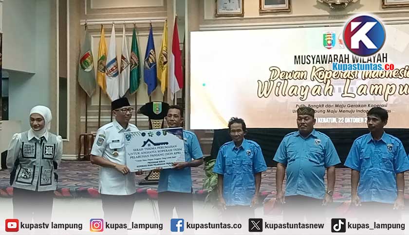 Kupastuntas.co, Bandar Lampung – Wajah bahagia para buruh pelabuhan tampak jelas saat Koperasi Tenaga Kerja Bongkar Muat (TKBM) Pelabuhan Panjang kembali menyerahkan 40 unit rumah gratis kepada para anggotanya. Penyerahan berlangsung di sela kegiatan Musyawarah Wilayah Dewan Koperasi Indonesia (Dekopin) Wilayah Lampung, di Balai Keratun, kompleks Kantor Pemerintah Provinsi Lampung, Rabu (22/10/2025).