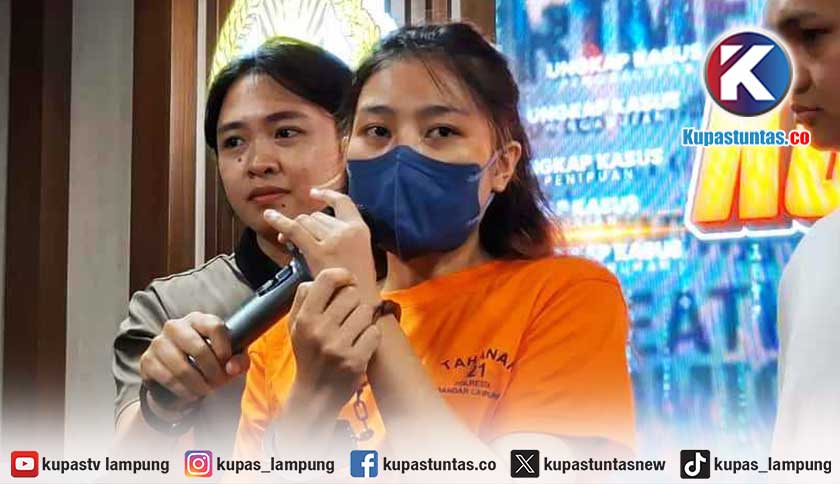 Windi (28), pelaku penganiayaan terhadap kekasih gelap, saat dihadirkan dalam konferensi pers di Mapolresta Bandar Lampung, Rabu (22/10/2025). Foto: Yudi/kupastuntas.co