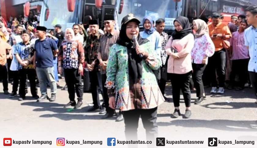 Kupastuntas.co, Bandar Lampung - Walikota Bandar Lampung Hj. Eva Dwiana melepas keberangkatan jamaah umrah tahun 2025 di halaman Pemkot Bandar Lampung, Minggu 2 November 2025.