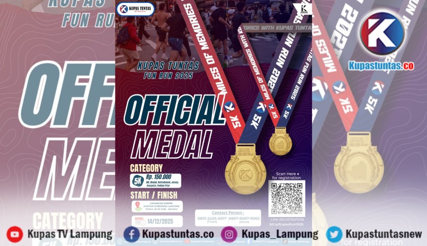 Kupastuntas.co, Bandar Lampung - Panitia Kupas Tuntas Fun Run 2025 resmi merilis desain medali yang akan diberikan kepada seluruh peserta ajang lari tahunan tersebut.