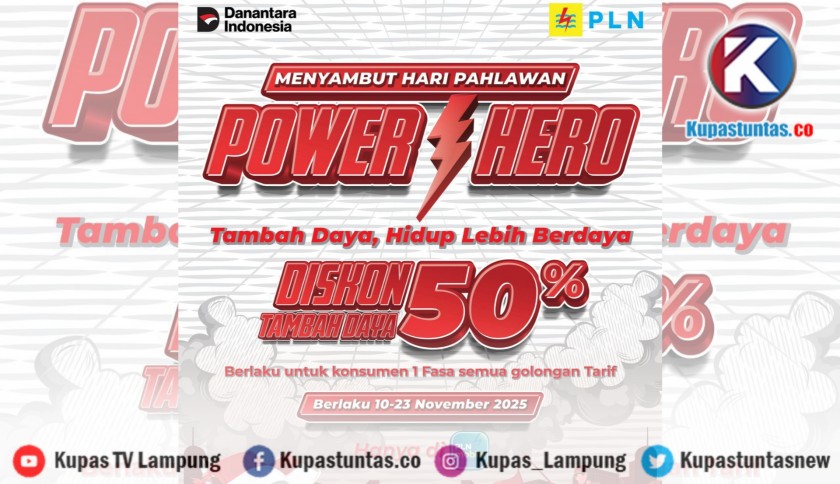 Kupastuntas.co, Bandar Lampung - Dalam semangat memperingati Hari Pahlawan 2025, PT PLN (Persero) menghadirkan program promo bertajuk “Power Hero”, yang memberikan diskon 50% untuk biaya tambah daya listrik bagi pelanggan setia.