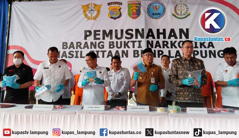 Pemusnahan barang bukti narkoba hasil ungkap BNN Lampung yang berlokasi di Panggung Satpol PP, Selasa (18/11/2025). Foto: Ria/Kupastuntas.co