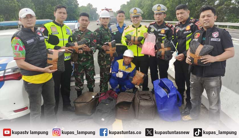 Petugas Patroli dan Keamanan Jalan Tol Bakauheni–Terbanggi Besar (Bakter) menunjukkan barang bukti diduga narkotika dari mobil yang kecelakaan. Foto: Ist