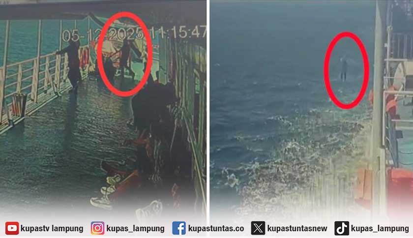 Detik-detik seorang penumpang nekat melompat dari KMP Dorothy usai bertolak dari Dermaga 3 Pelabuhan Bakauheni terekam CCTV. Foto: Ist
