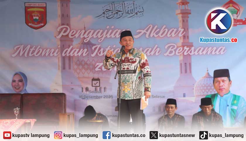 Bupati Lampung Barat Parosil Mabsus dalam acara Pengajian Akbar MTBMI Zona I yang digelar di Pekon Puramekar, Kecamatan Gedung Surian, Selasa (16/12/2025). Foto: Ist