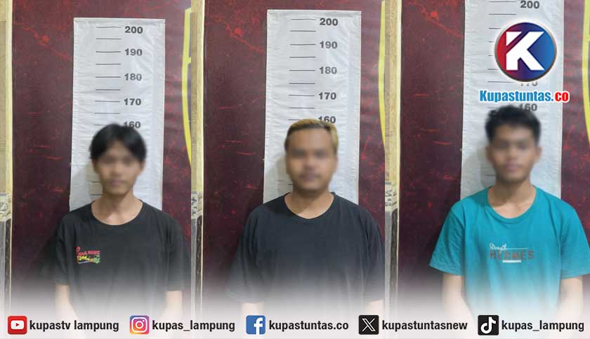 Potret ketiga terduga pelaku pencabulan remaja disabilitas di Metro saat diamankan di Mapolres Metro. (Dok. Satreskrim Polres Metro)