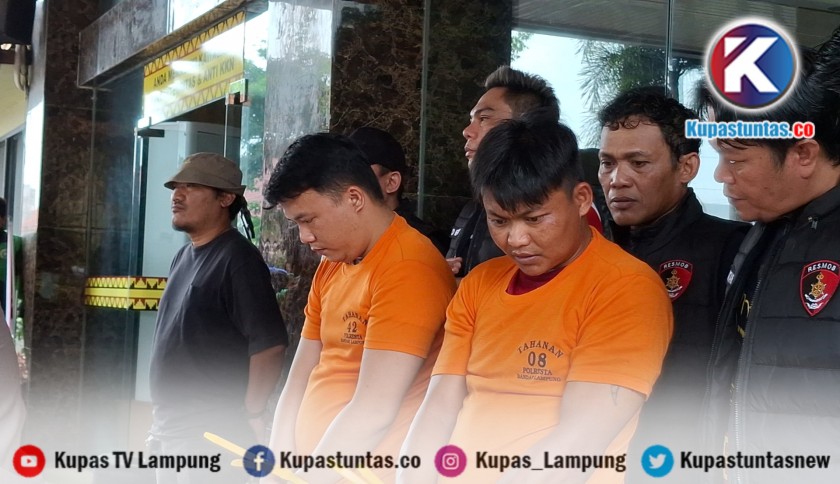 Kedua tersangka saat dihadirkan dalam konferensi pers di Mapolresta Bandar Lampung. Foto: Yudi/kupastuntas.co