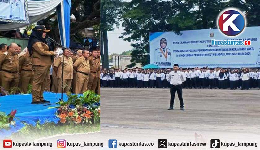 Kupastuntas.co, Bandar Lampung - Walikota Bandar Lampung Eva Dwiana menyerahkan sebanyak 5.823 Surat Keputusan (SK) Pegawai Pemerintah dengan Perjanjian Kerja (PPPK) Paruh Waktu. Kegiatan tersebut digelar di Lapangan Saburai, Bandar Lampung, Selasa (30/12/2025).