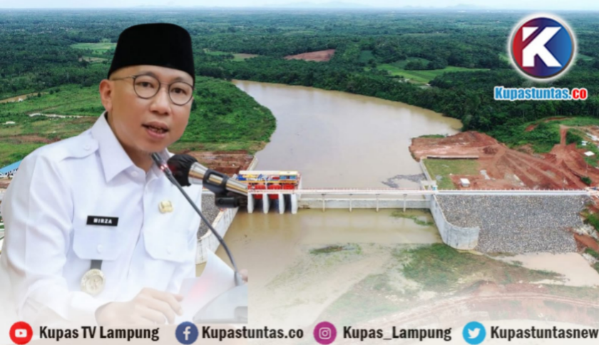 Gubernur Lampung Rahmat Mirzani Djausal dan Bendungan Marga Tiga. Foto: Ist