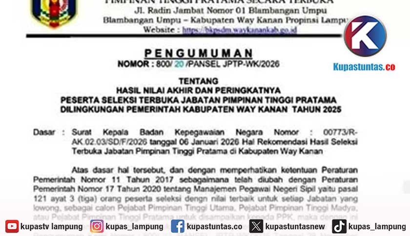 Kupastuntas.co, Way Kanan - Panitia Seleksi Jabatan Pimpinan Tinggi Pratama (JPTP) Kabupaten Way Kanan secara resmi mengumumkan hasil akhir seleksi terbuka tahun anggaran 2025.