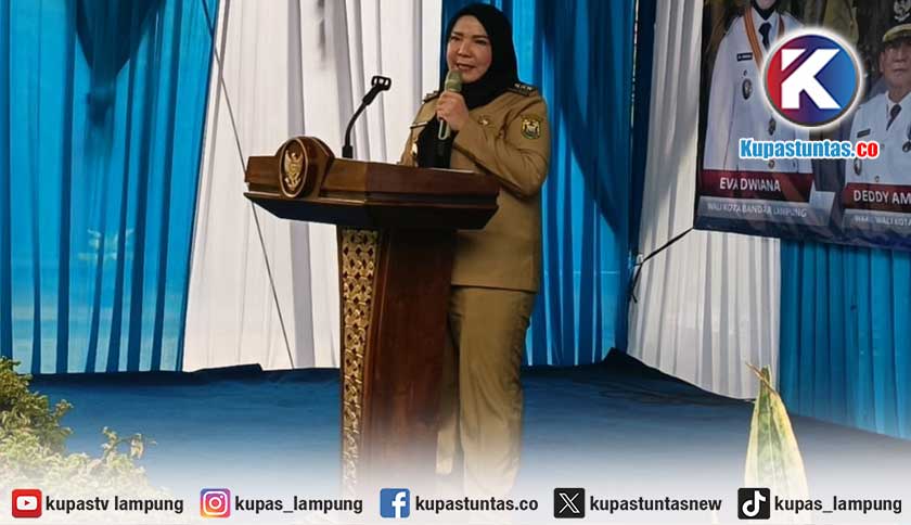 Walikota Bandar Lampung, Eva Dwiana saat memberikan sambutan dalam sebuah kegiatan di SMP Negeri 31 Bandar Lampung, Senin (26/1/2026). Foto: Sri/Kupastuntas.co