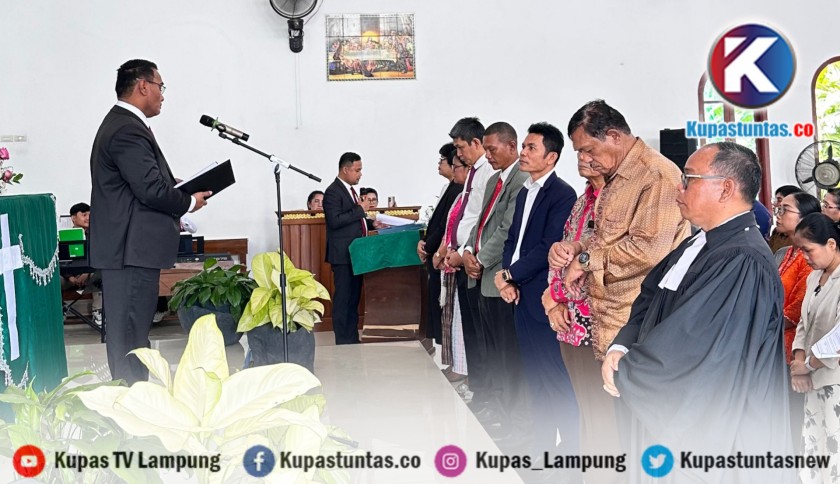 Kupastuntas.co, Lampung Selatan - Praeses HKBP Distrik XXXII Lampung, Pdt. Mauli H. Aritonang, S.Th, melantik Panitia Tahun Transformasi HKBP Distrik XXXII Lampung Tahun 2026, dalam rangkaian Ibadah Syukuran Awal Tahun HKBP Distrik XXXII Lampung sekaligus Launching Orientasi Pelayanan HKBP Tahun 2026, yang digelar di HKBP Resort Agaphe Natar, Lampung Selatan, Senin (26/1/2026).