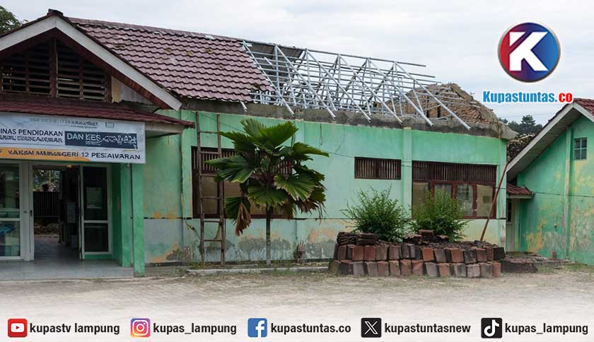 Kupastuntas.co, Pesawaran - Di sebuah sudut SMP Negeri 12 Kabupaten Pesawaran, tumpukan genteng yang semula menjadi bagian dari bangunan sekolah kini tak lagi utuh.