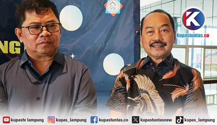 Ketua Umum DPP Apersi, Junaidi Abdillah (pakai kemeja) dan Ketua DPD Apersi Provinsi Lampung, Mario Aryanto (pakai batik), saat ditemui di Hotel Azana Lampung, Selasa (10/2/2026). Foto: Sri/kupastuntas.co