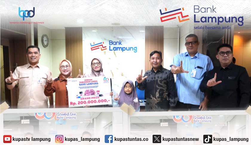 Kupastuntas.co, Bandar Lampung – Pjs. Direktur Utama Bank Lampung, Indra Merviana didampingi seluruh Direksi Bank Lampung menyerahkan hadiah uang tunai Rp200 juta kepada Mas Amah peraih grand prize Undian tabungan Simpeda lokal Bank Lampung, Jum'at (20/2/2026) di kantor pusat Bank Lampung.
