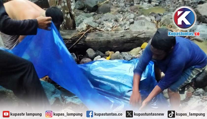 Warga saat mengevakuasi jasad Suroso yang hilang sejak Sabtu (21/2/2026) dan ditemukan di sepanjang aliran Way Ngarip. Foto: Ist