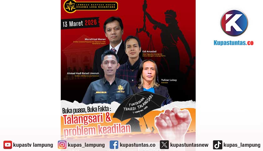 Kupastuntas.co, Bandar Lampung – Lembaga Bantuan Hukum Dharma Loka Nusantara akan menggelar diskusi publik yang dirangkai dengan kegiatan buka puasa bersama di Dusun Talangsari, Desa Rajabasa Lama, Kecamatan Way Jepara, Kabupaten Lampung Timur, Jumat (13/3/2026).