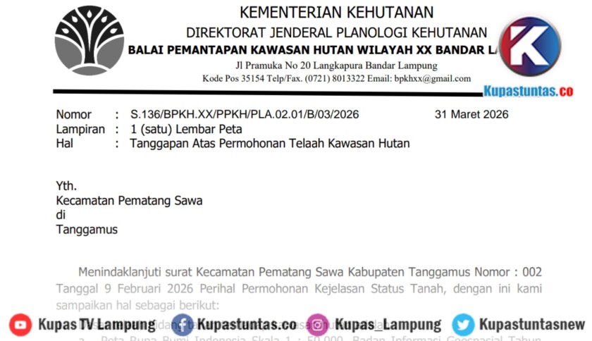 Kepastian itu tertuang dalam surat resmi BPKH bernomor S.136/BPKH.XX/PPKH/PLA.02.01/B/03/2026 tertanggal 31 Maret 2026, sebagai tanggapan atas permohonan telaah status tanah dari Kecamatan Pematangsawa, Kabupaten Tanggamus.