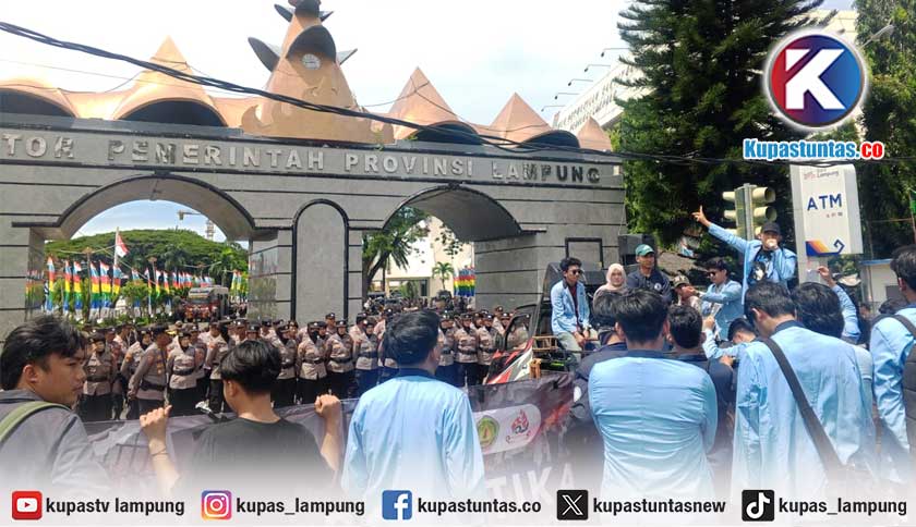 Aliansi Lampung Melawan menggelar aksi demonstrasi di Gedung DPRD Provinsi Lampung, Selasa (7/4/2026). Foto: Sandika/Kupastuntas.co