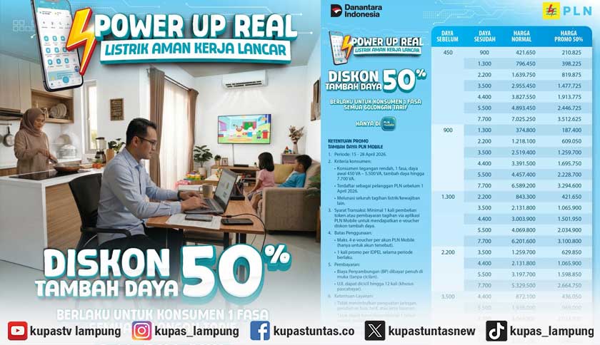 Kupastuntas.co, Bandar Lampung - Seiring meningkatnya aktivitas masyarakat yang semakin bergantung pada listrik, PT PLN (Persero) menghadirkan program promo spesial bertajuk “Power Up Real: Listrik Aman Kerja Lancar” dengan memberikan diskon 50 persen biaya tambah daya listrik bagi pelanggan.