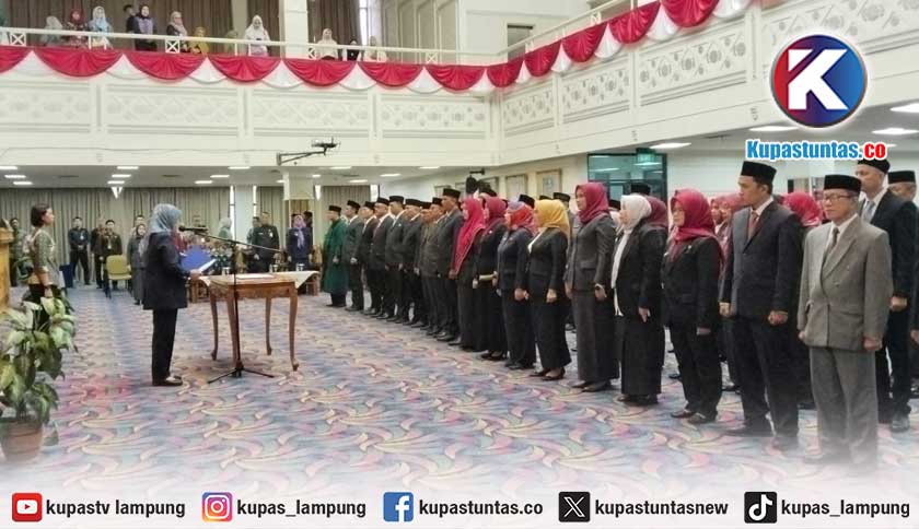Kupastuntas.co, Bandar Lampung - Pemerintah Provinsi (Pemprov) Lampung menggelar pelantikan dan pengambilan sumpah jabatan pejabat administrator, pejabat pengawas dan pejabat fungsional, Jum'at (10/10/2025) sore.Pelantikan yang berlangsung di lantai