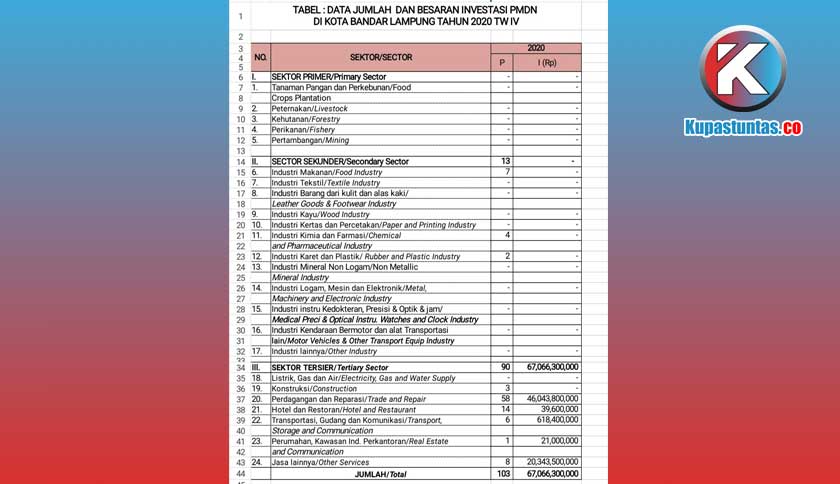 Realisasi Investasi di Bandar Lampung Tahun 2020 Naik