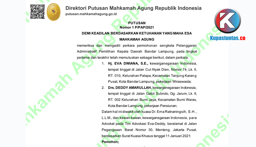 MA Kabulkan Gugatan Paslon Eva-Deddy dan Batalkan Putusan KPU Bandar Lampung