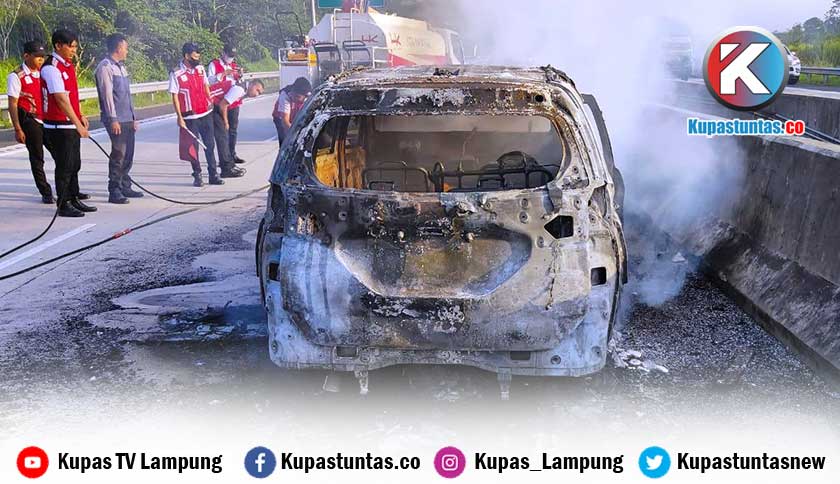 Tabrak Potongan Besi di Jalan Tol Lampung, Mobil Minibus Hangus Terbakar