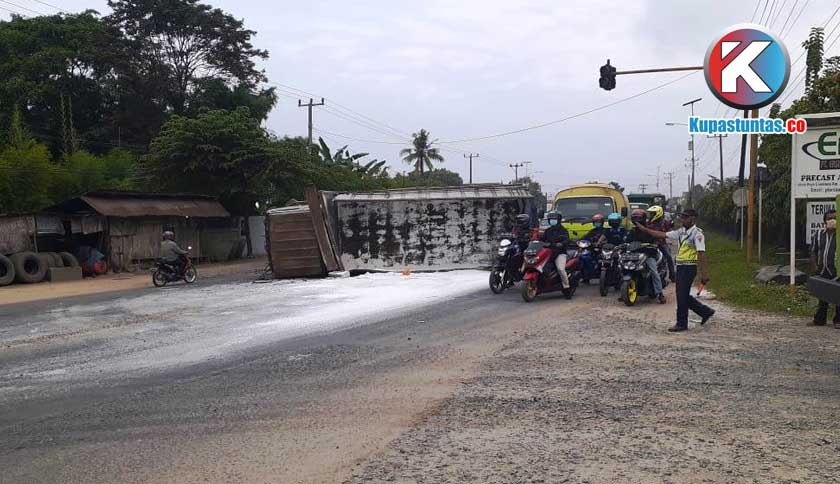 Hindari Motor, Truk Bermuatan Tepung Sagu Terguling di Natar Lamsel