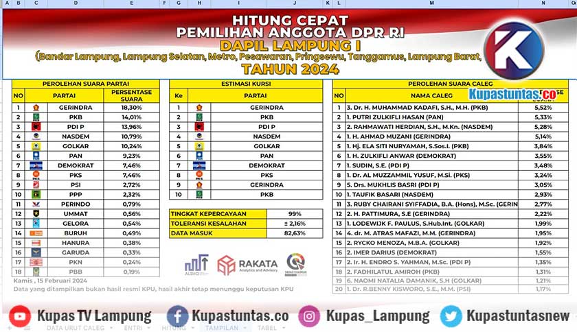 Data Masuk 82,63 Persen, Berikut Update Quick Count Caleg DPR RI Dapil Lampung 1