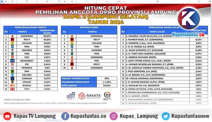 Quick Count Rakata Caleg DPRD Provinsi Lampung Dapil 2 Lamsel, Data Masuk 53,66 Persen